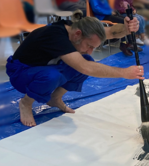 Artno pose le pinceau sur le tissu pour laisser parler son énergie, tel un exutoire grâce au mouvement d’un geste spontané.