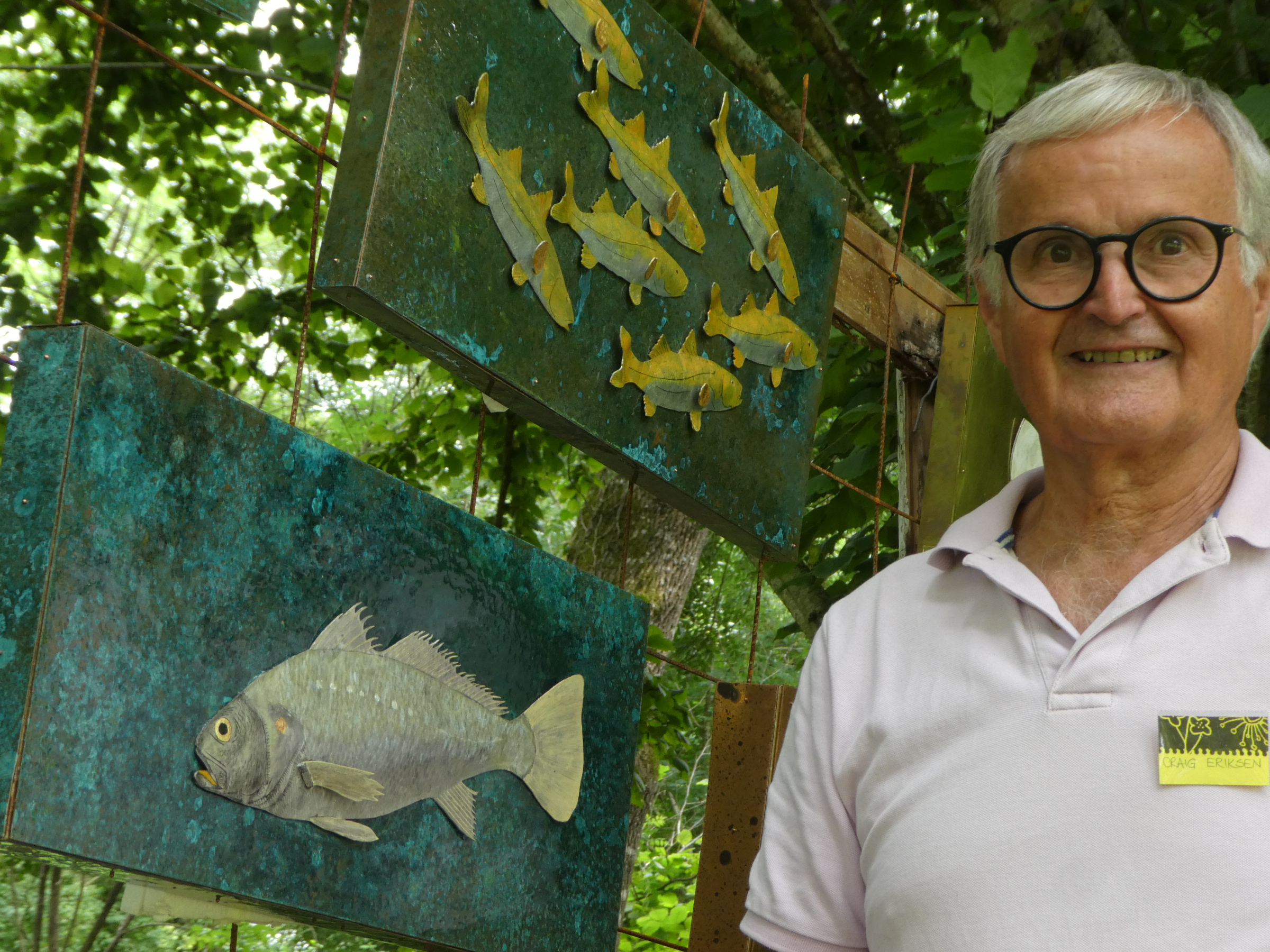 Craig sculpte principalement des poissons : Truite arc-en-ciel, Truite brune, Saumon, maquereaux, thon, en banc ou solitaire, les poissons brillent de toutes leurs écailles...d'étain. Les encadrements sont en cuivre ou en laiton.