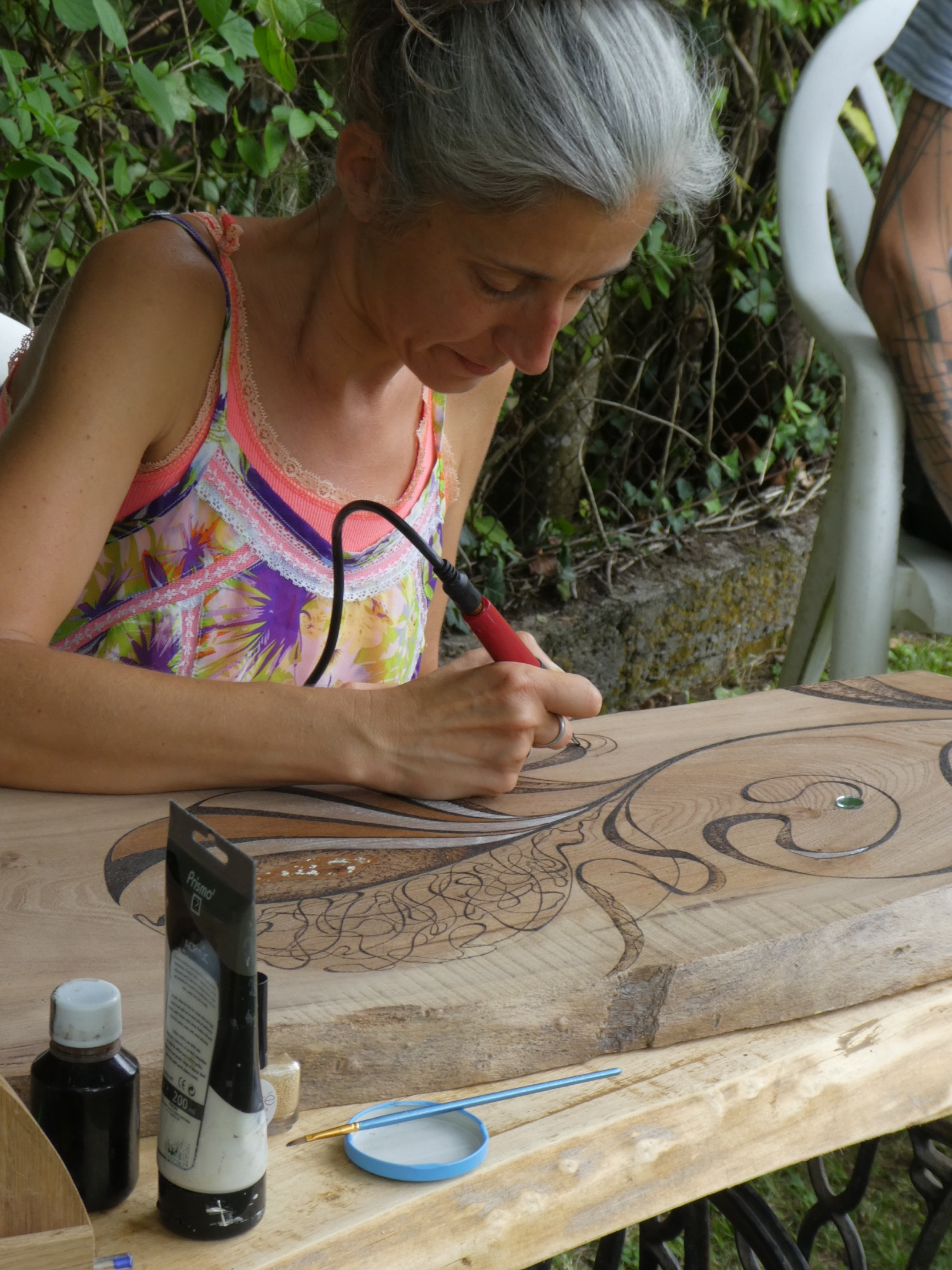 Mes pyrogravures sont un condensé de tout ce qui me fait vibrer : le dessin, la peinture, me balader et chiner un peu partout, j'incruste ou je colle selon mes envies tout ce que j'aurais déniché au fils de mes balades : pierres, galets, morceaux d'écorce, perles, arbres de mer, coquillages.