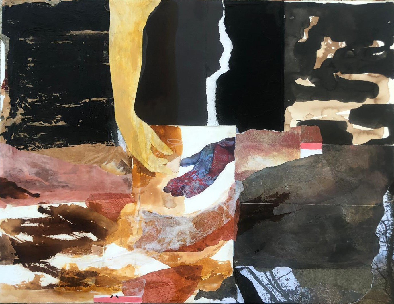 Travail d’abord abstrait, puis actuellement, sans délaisser l’expression, la rêverie, le jeu, la densité que permettent des matières, couleurs et formes abstraites, j’ajoute des éléments figuratifs, qui traduisent un besoin de narration.